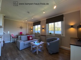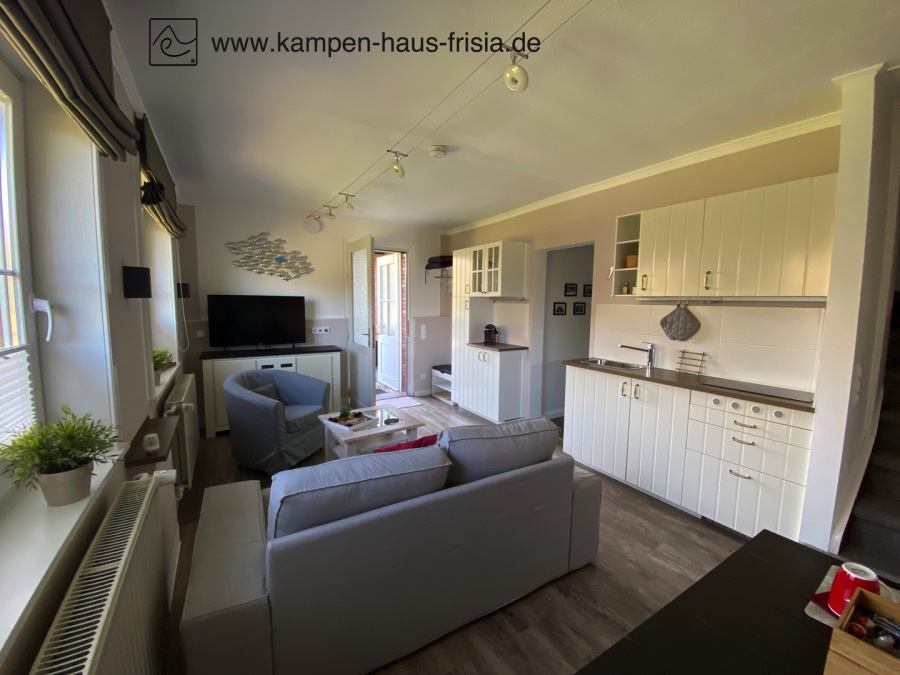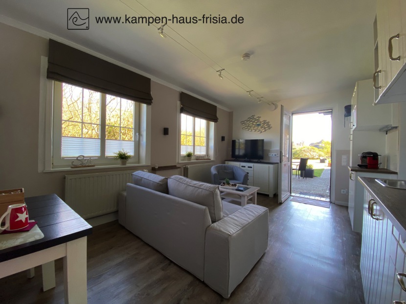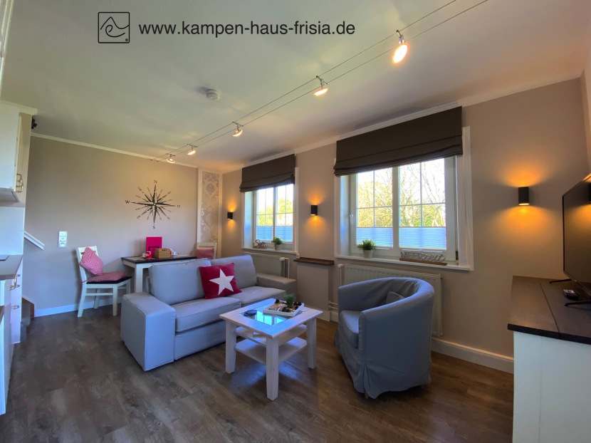 Wohn-/Küche/Esszimmer mit 4K UHD-TV 43" 108 cm, Radio, USB-Ladestation, Couch 2-Sitzer, Sessel, Tisch, Esstisch für 2 Personen, Garderobe, Fenster mit