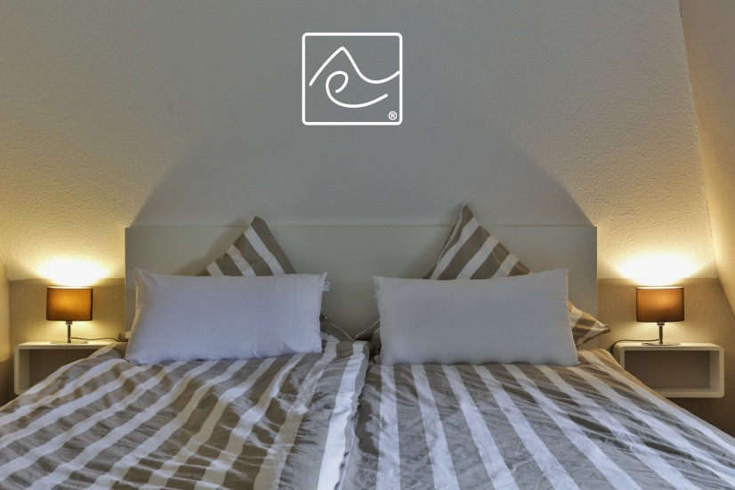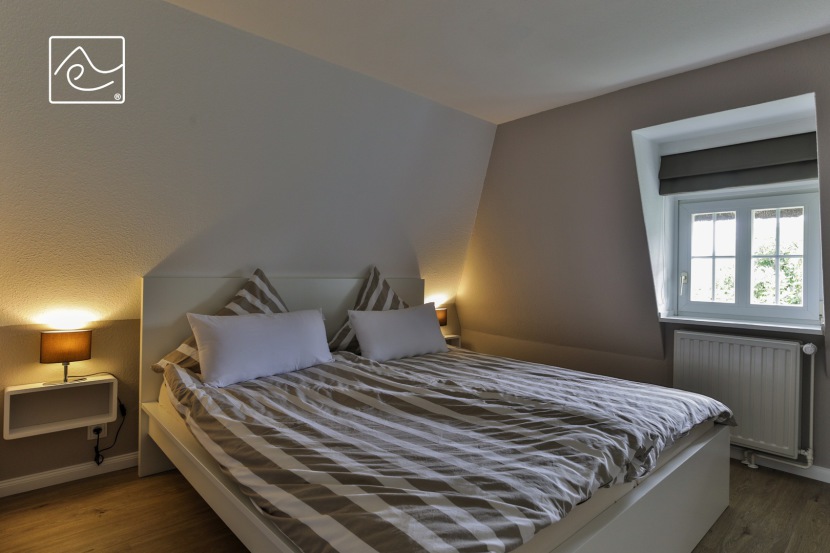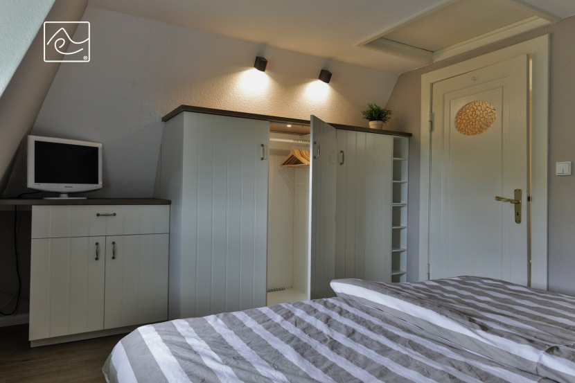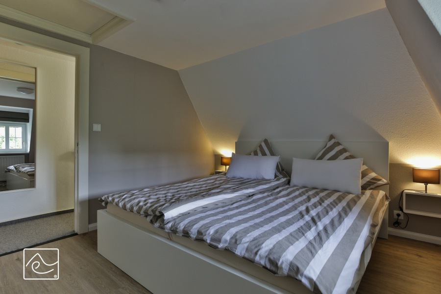 Schlafzimmer mit Doppelbett 180 x 200cm (ohne Fußteil), Kleiderschrank und Flat-TV im Dachgeschoß (1. Etage). Fenster mit Raffrollo.