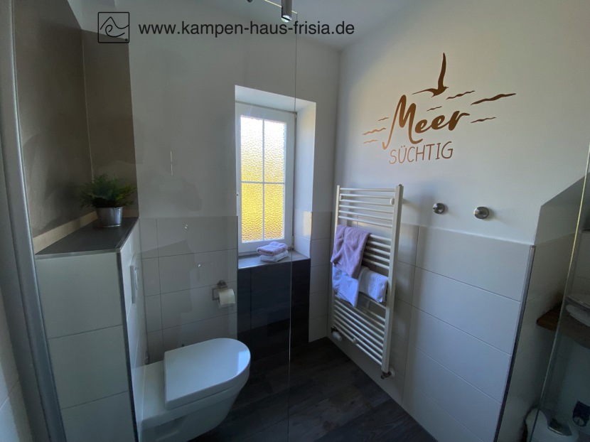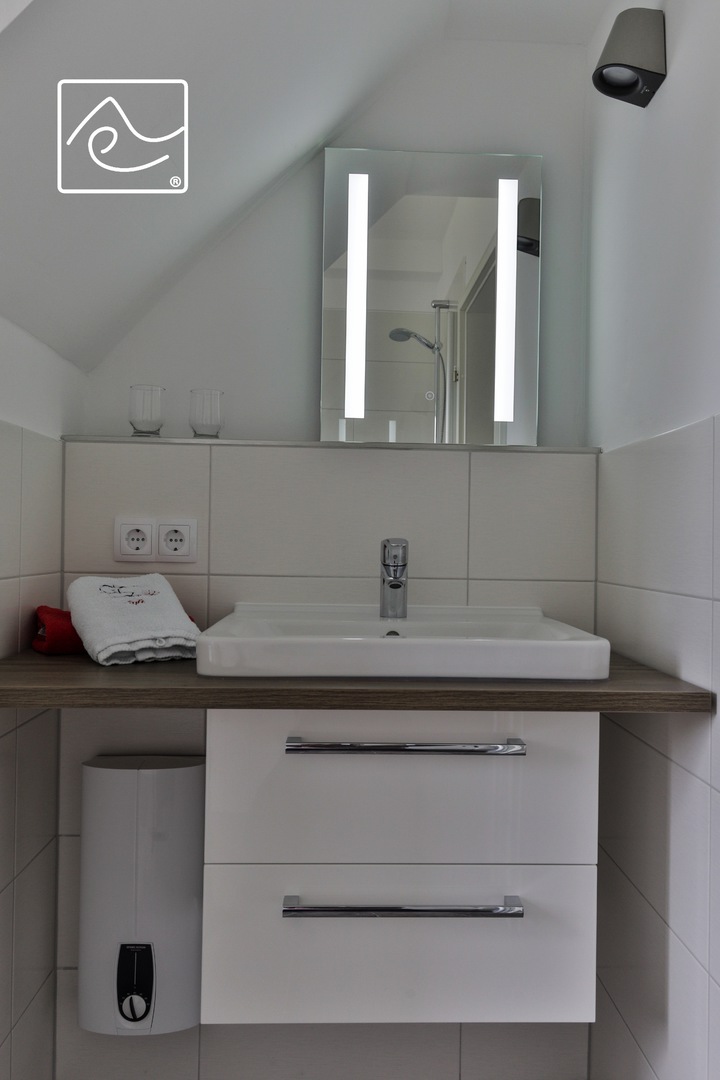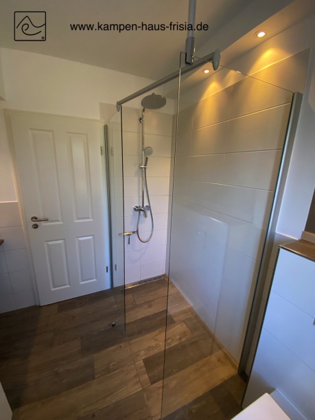 Badezimmer mit bodenebener Walk-In Dusche 80 x 140cm (Regen-/Showerdusche), Hänge-WC, Spiegel mit Beleuchtung, Föhn, Handtuchheizung und Waschtisch im