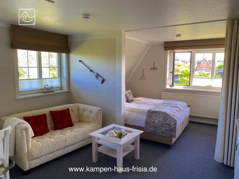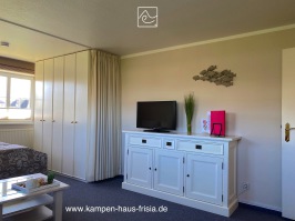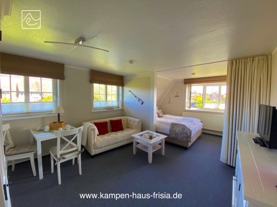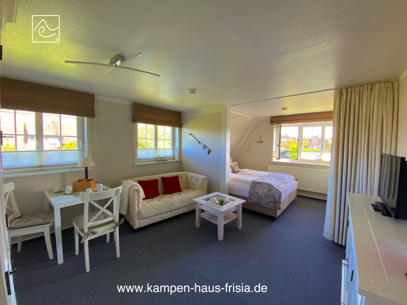 Wohn-/Schlaf-/Essraum mit Fenster nach Süden und Osten, HD-Flat-TV 80cm, Couch 2-Sitzer, Tisch, Esstisch variabel 75 x 80/120cm für 2 Personen, Box-Springbett (Hotelqualität) 160 x 200cm mit zusätzlichem Gel-Topper, Kleiderschrank, Sideboard, Vitrinenschrank,