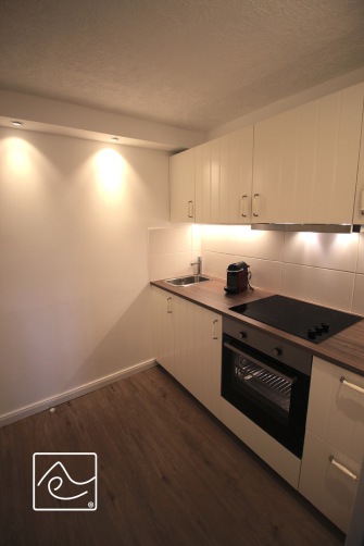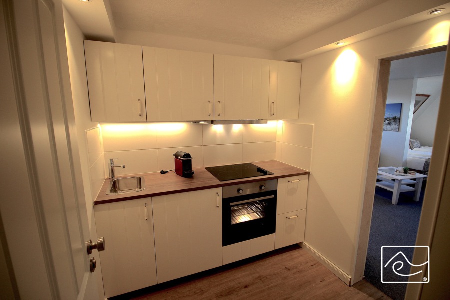 Küche mit 3er-Ceran-Kochfeld, Backofen, Kühlschrank mit GF, Kaffee- und Nespressomaschine (ohne Milchaufschäumer), Toaster,