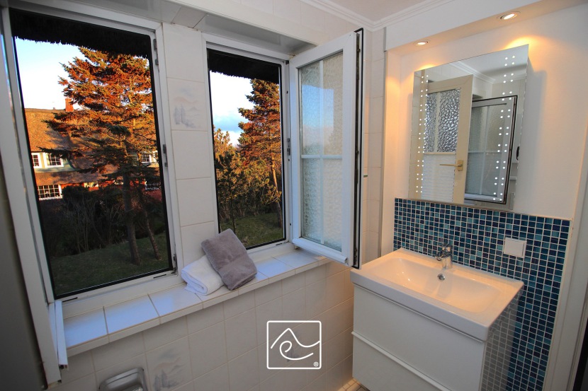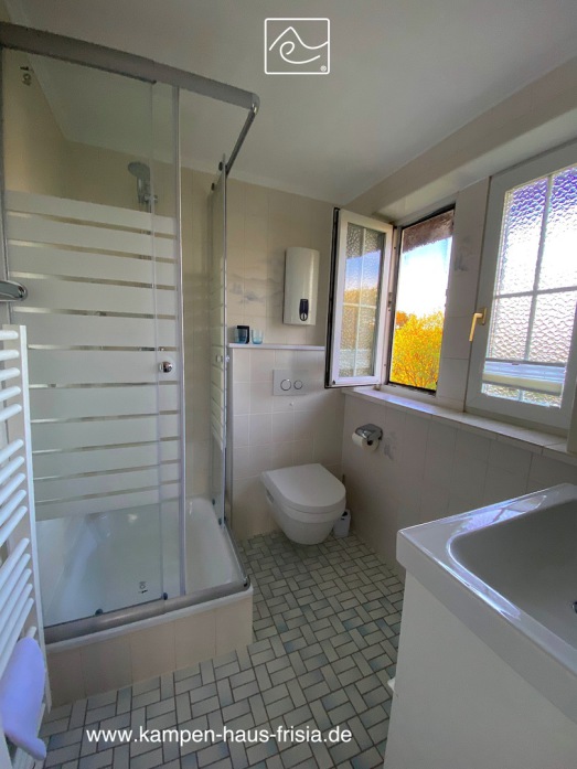Badezimmer mit Dusche 80 x 80cm, Hänge-WC, Handtuchheizung, Spiegel, Waschtisch mit Auszügen, Föhn,