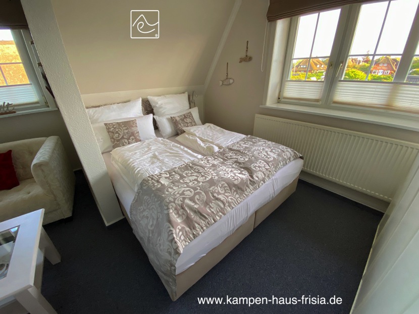 Alle Fenster mit Plissees, Schlafraum mit zusätzlicher Raffrollos.
